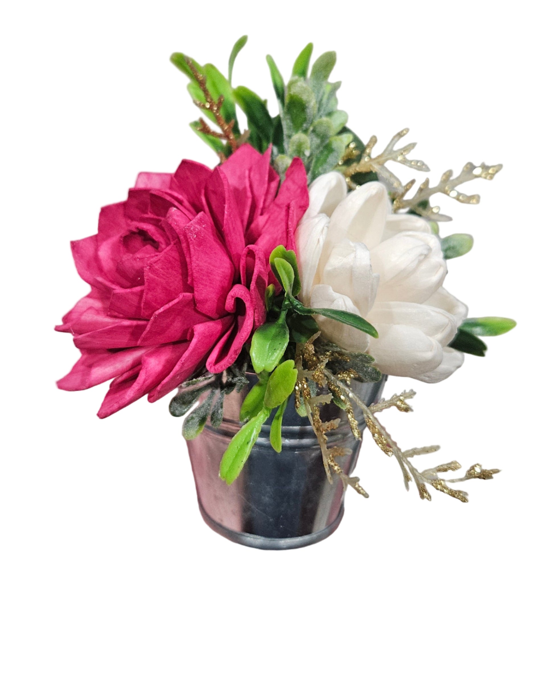Small metal bucket bursting with colorful blooms. Measuring approx. 4"x4"x3" with the ability to self stand or be used as a magnet. Select up to two colors to customize your buckets. Greenery/accents will be selected by our expert florist to compliment your color choices. Flower styles will vary.